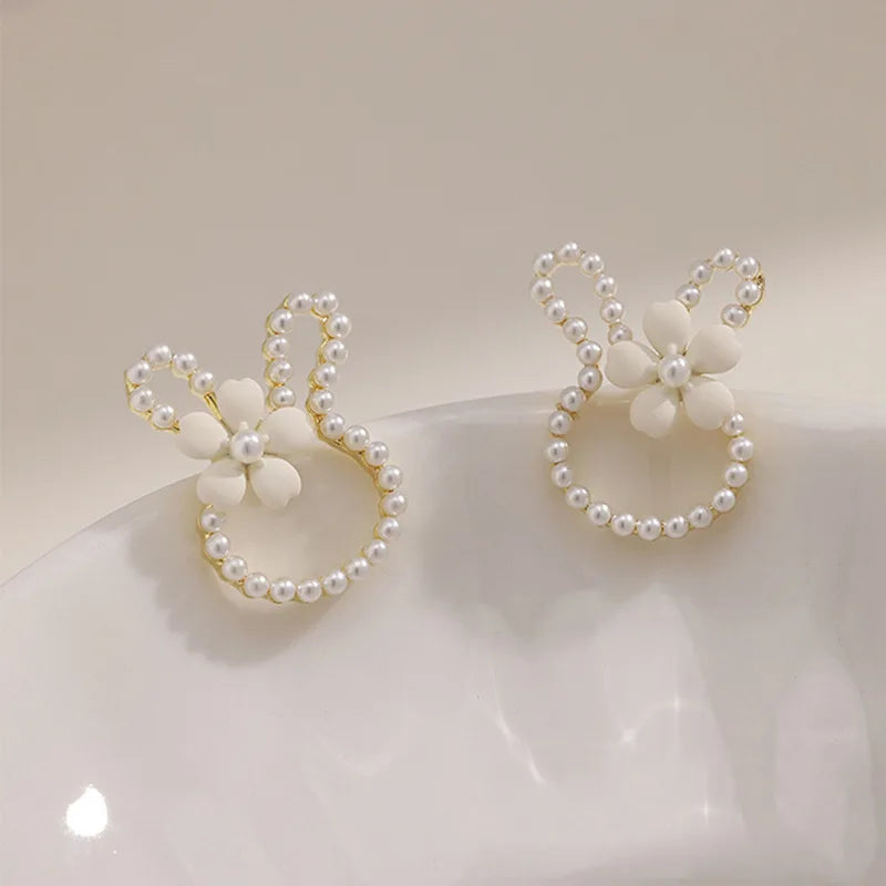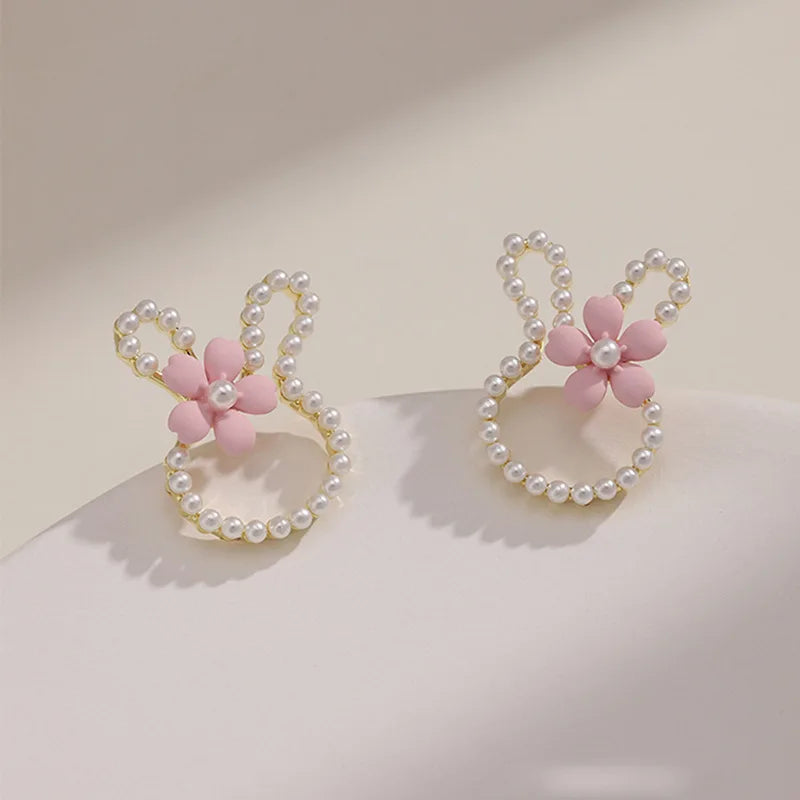 Boucles d'oreilles à tige en forme de lapin pour femme, jolies boucles d'oreilles en forme de fleur, en zircone, avec perles, design de dessin animé, jolis bijoux, cadeau idéal