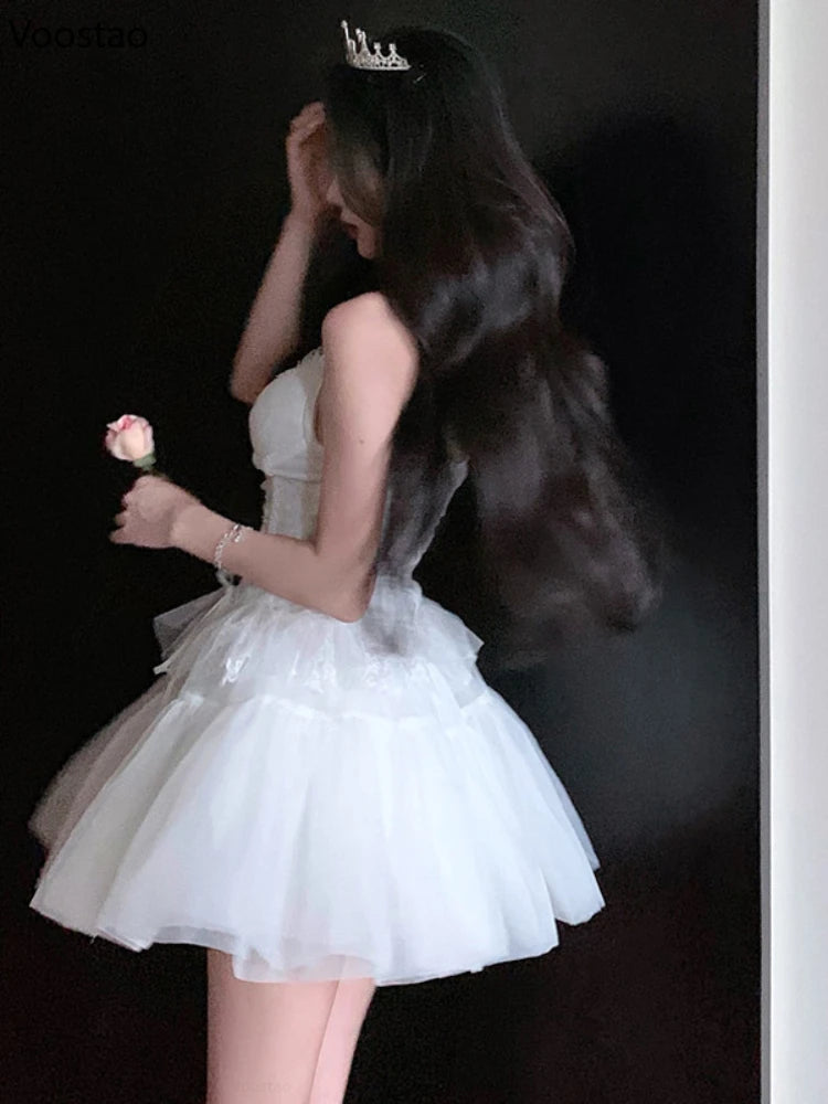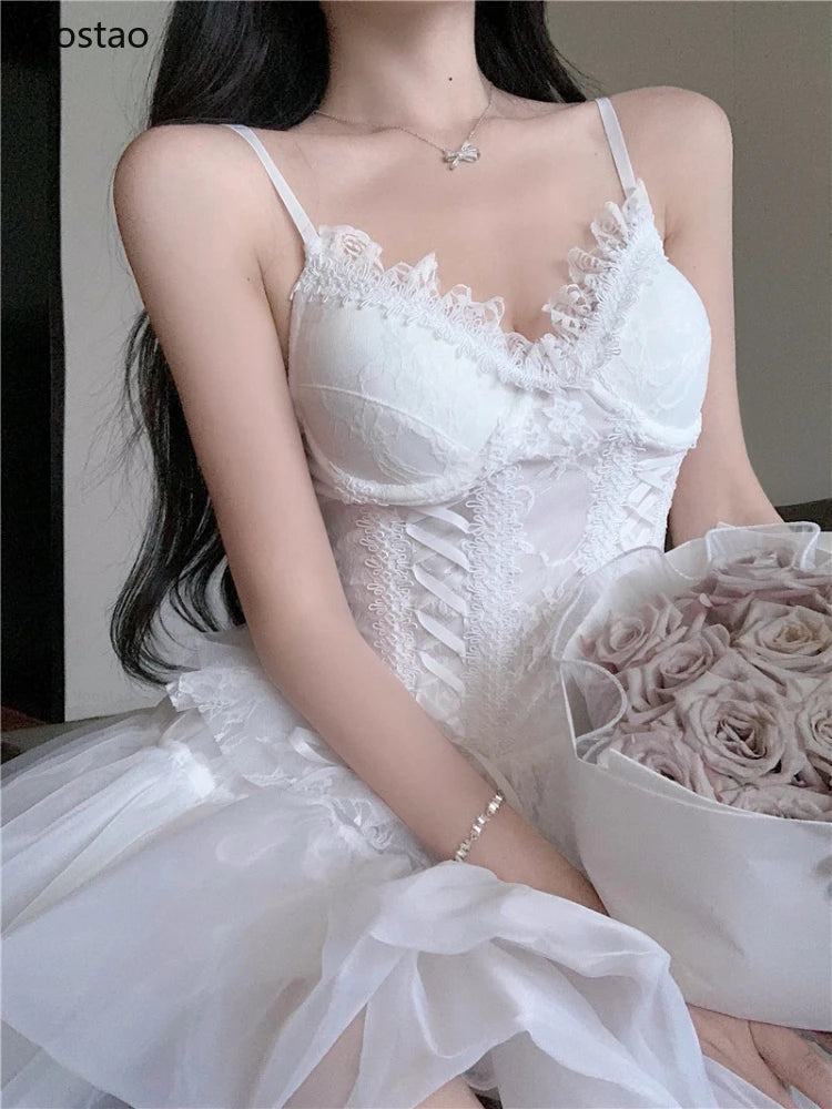 French Sexy Mesh Princess 2 Piece Set Women Beach V-Neck Lace Bandage Slim Camisole Crop Tops High Waist Fluffy Mini Skirts Suit
