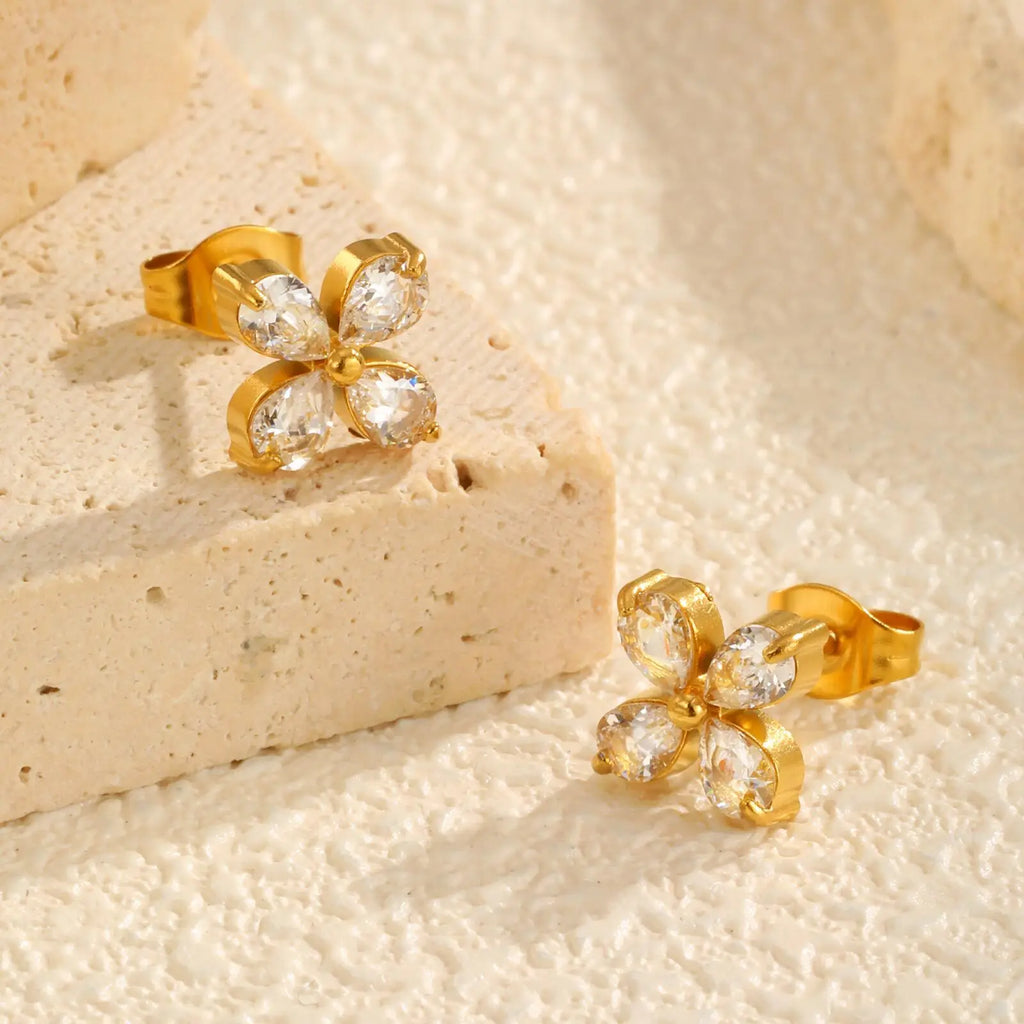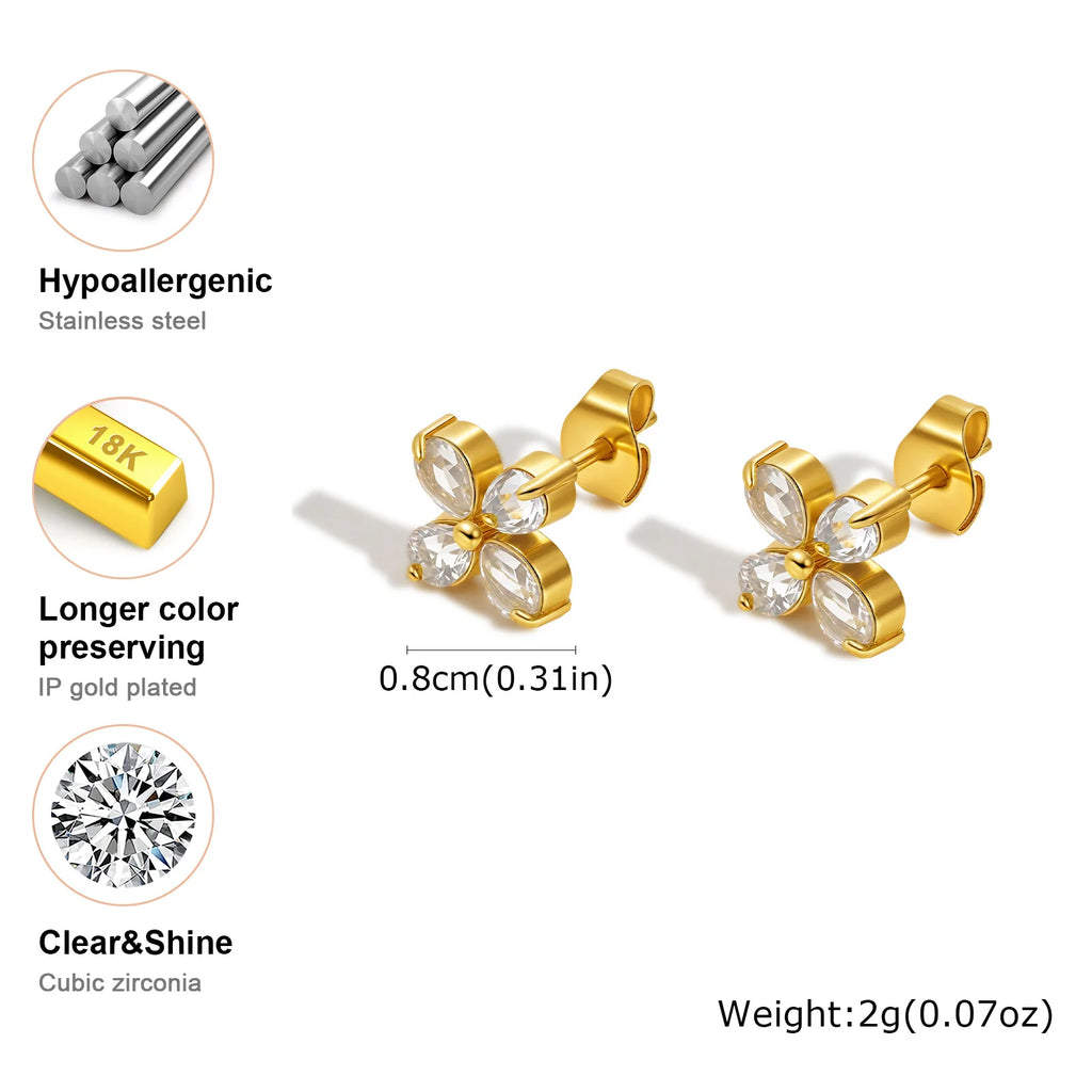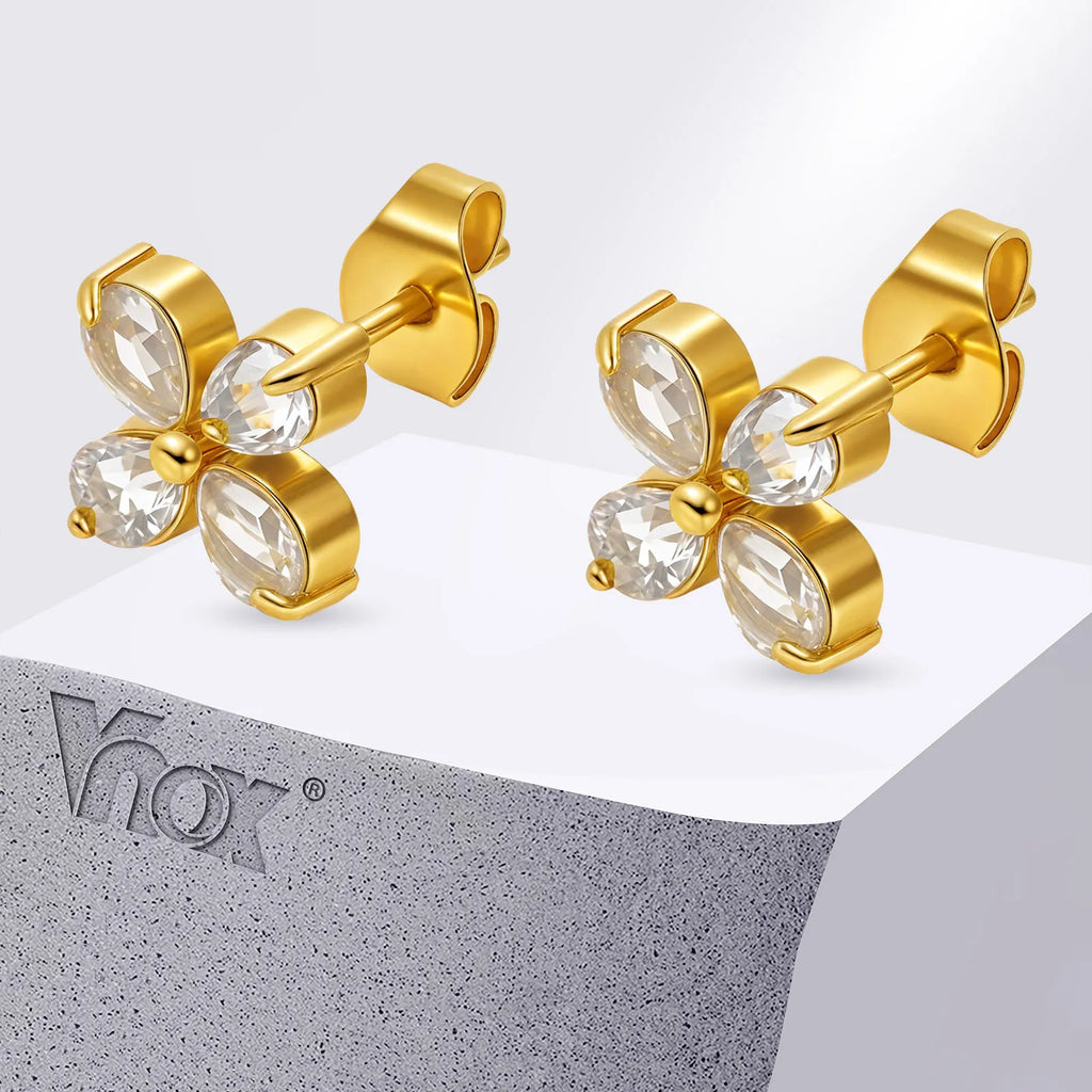 Vnox New Four Petal Zircon Stud Earrings For Women,Stainless Steel Hypoallergenic Screw Piercing Earring,Jewelry Girls Accessory