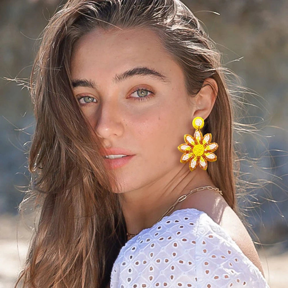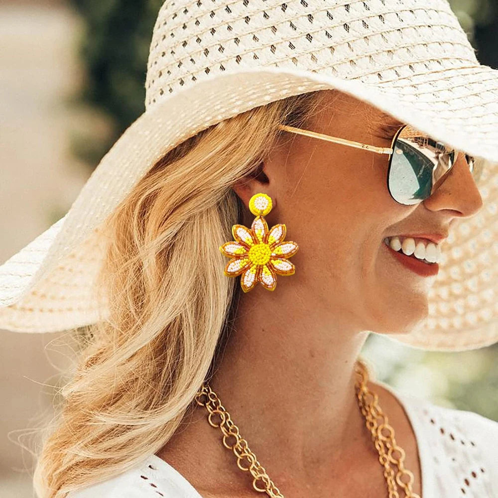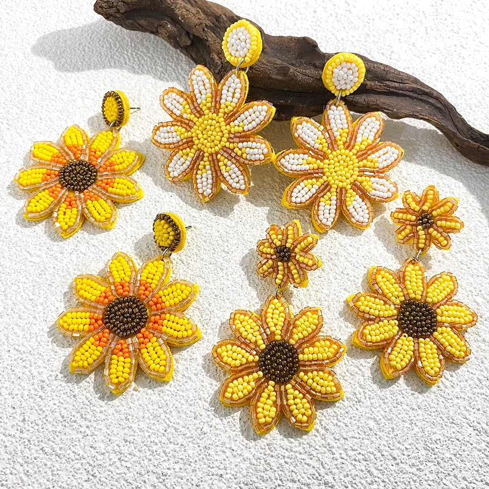 AENSOA Handmade Yellow Beaded Sunflower Drop Earrings for Women Girls Statement Seed Bead Floral Dangle Earrings Party Jewelry