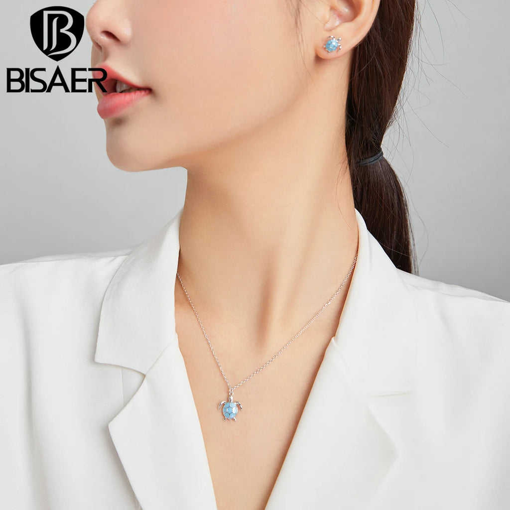 BISAER 100% 925 Sterling Silver Turtle Jewelry Set Necklace Earrings Plated Platinum For Women Beach Party Fine Jewelry Gift