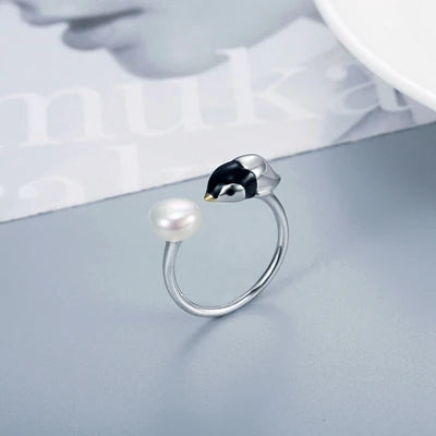 Fine Jewelry 925 Sterling Silver Adjustable Pearl Penguin Ring For Women Girl Anniversary Wedding Party Jewelry Gifts