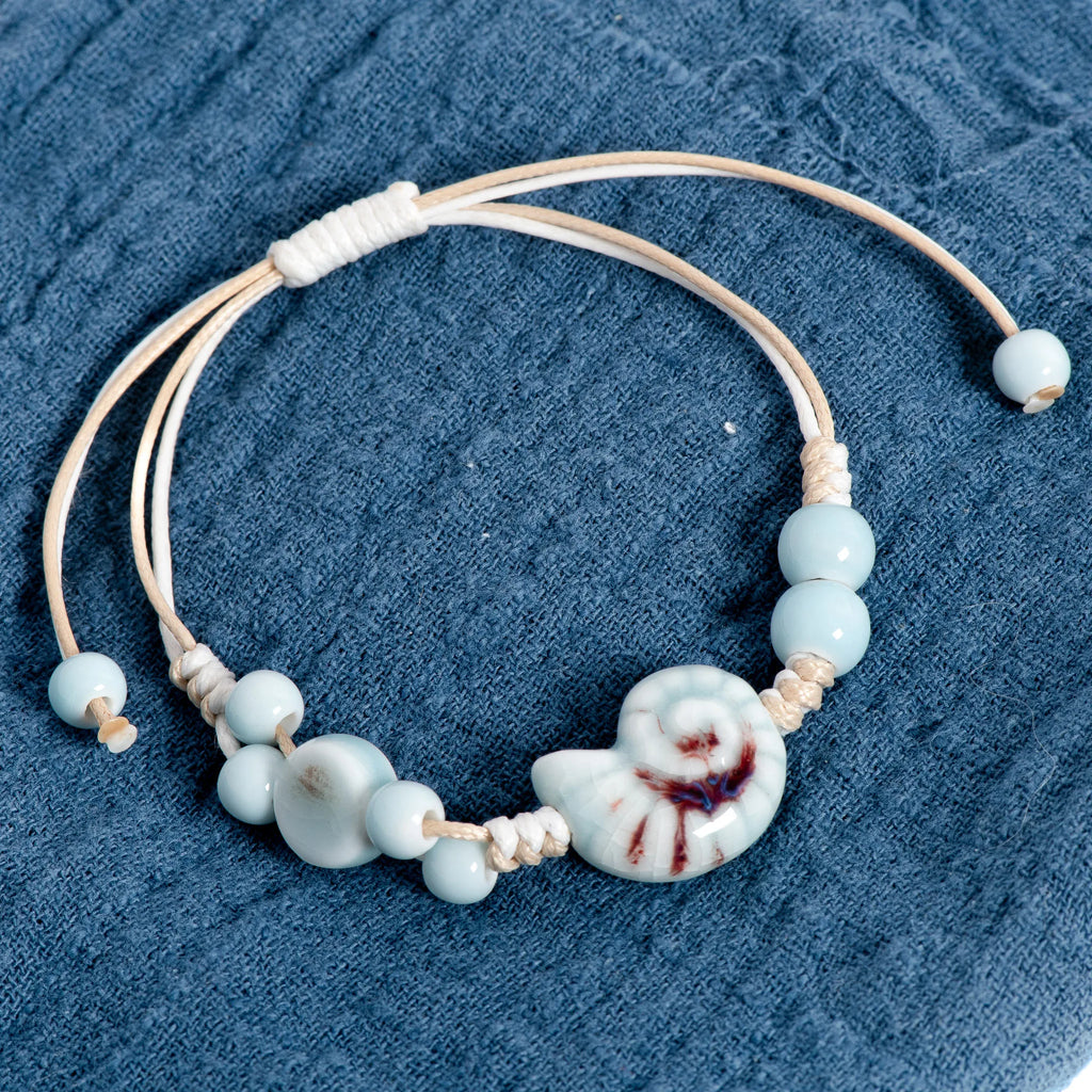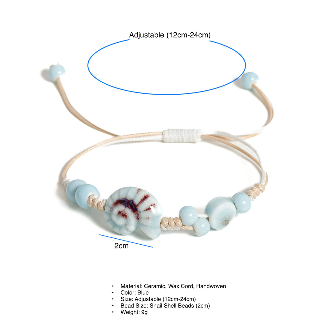 Handmade Blue Snail Shell Ceramic Bracelet Adjustable Handwoven Boho Jewelry for Women & Men - S02-005