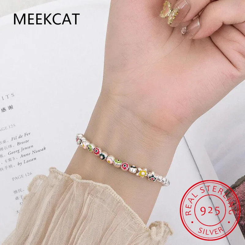Handmade Bohemian 925 Sterling Silver Flower Rainbow Enamel Beads Chain Ice Cream Charm Bracelet Pulseiras For Women Girl Gift
