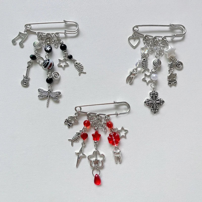 Handmade cluttered rockstar edgy red, black, and white pins beaded jewelry, bag pendant,safety pin、Original design