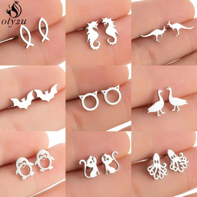 Korean Cute Stainless Steel Animal Earrings for Women Small Bat Octopus Fish Penguin Stud Earrings Trendy Jewelry Friends Gifts