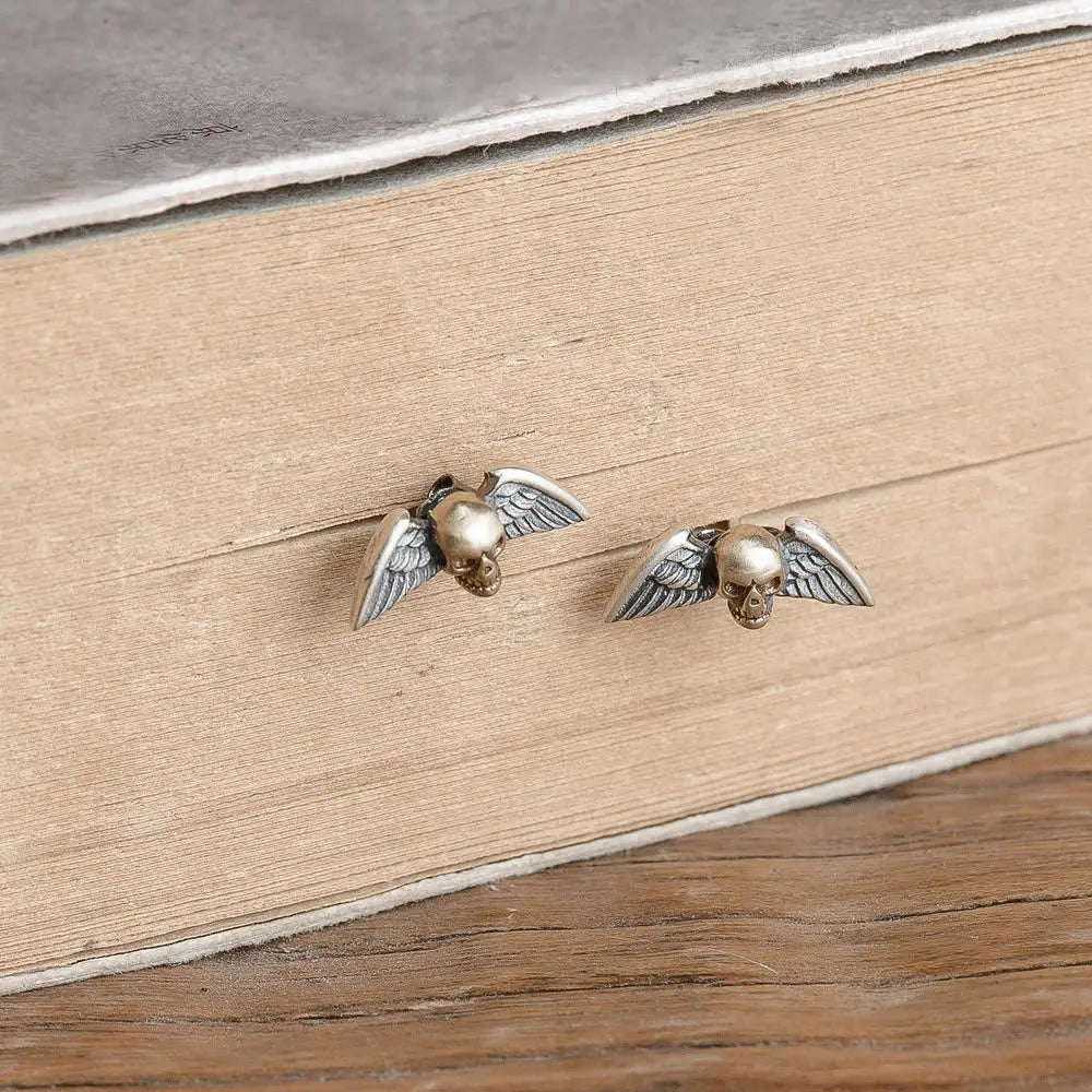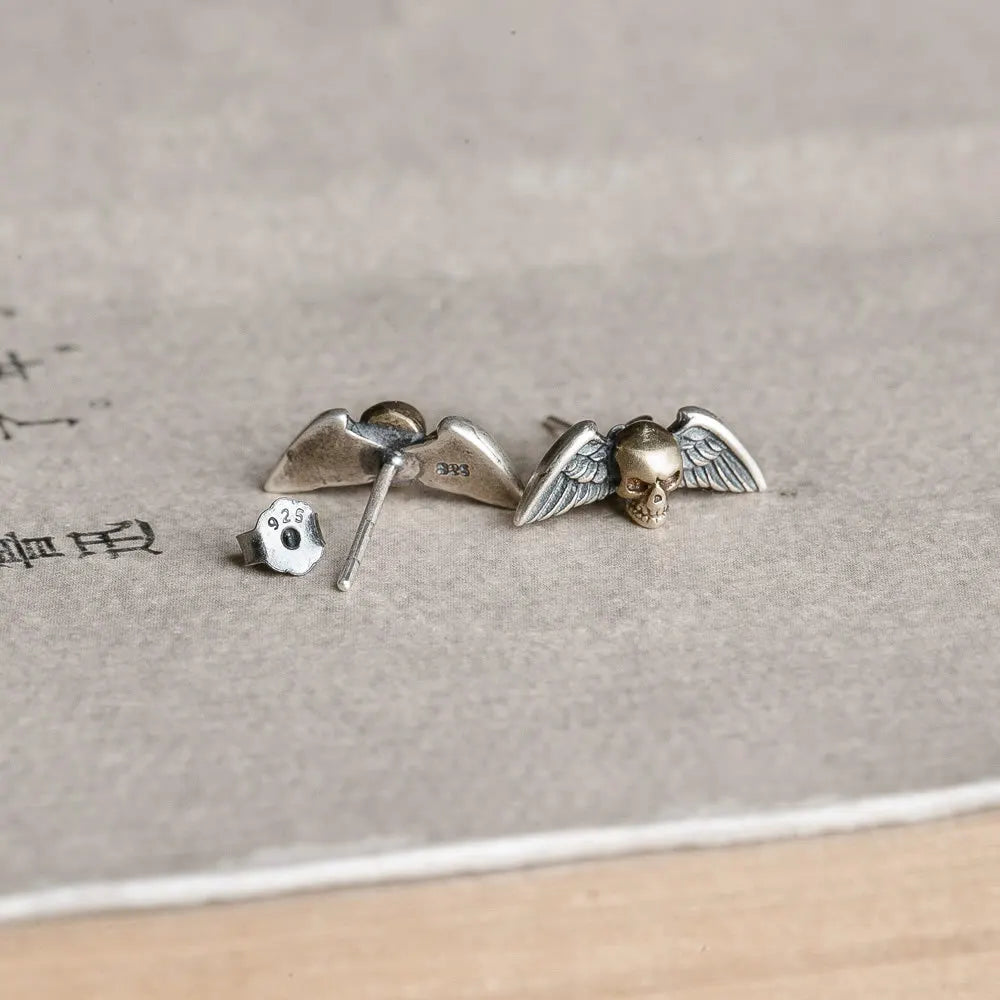 MKENDN 100% 925 Sterling Silver Creative Retro Skull Wings Stud Earring Trendy Street Punk Style Ear Pin for Men Women Jewelry
