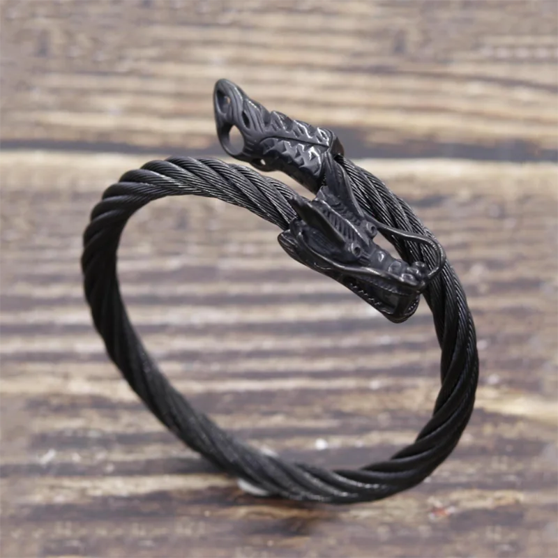 MKENDN Men Punk Viking Black Dragon Bangles Non-fading Stainless Steel Bracelet Vintage Open Cuff Charm Jewelry Norse Jewelry
