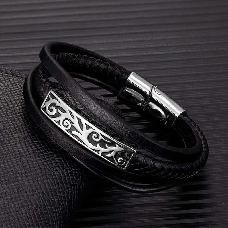 MKENDN Multi-layer Leather Wristband Vintage carved Accessories Men's Bracelet Stainless Steel Leather Bracelet Viking Jewelry