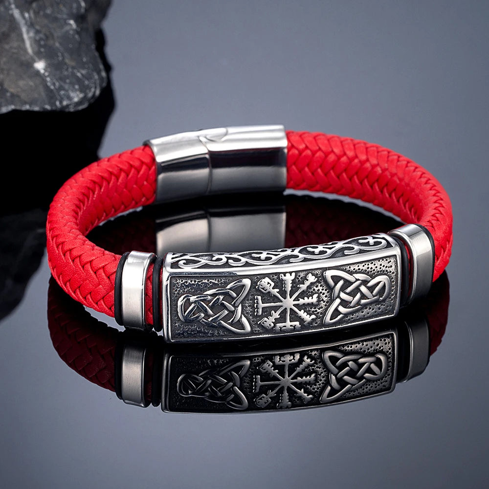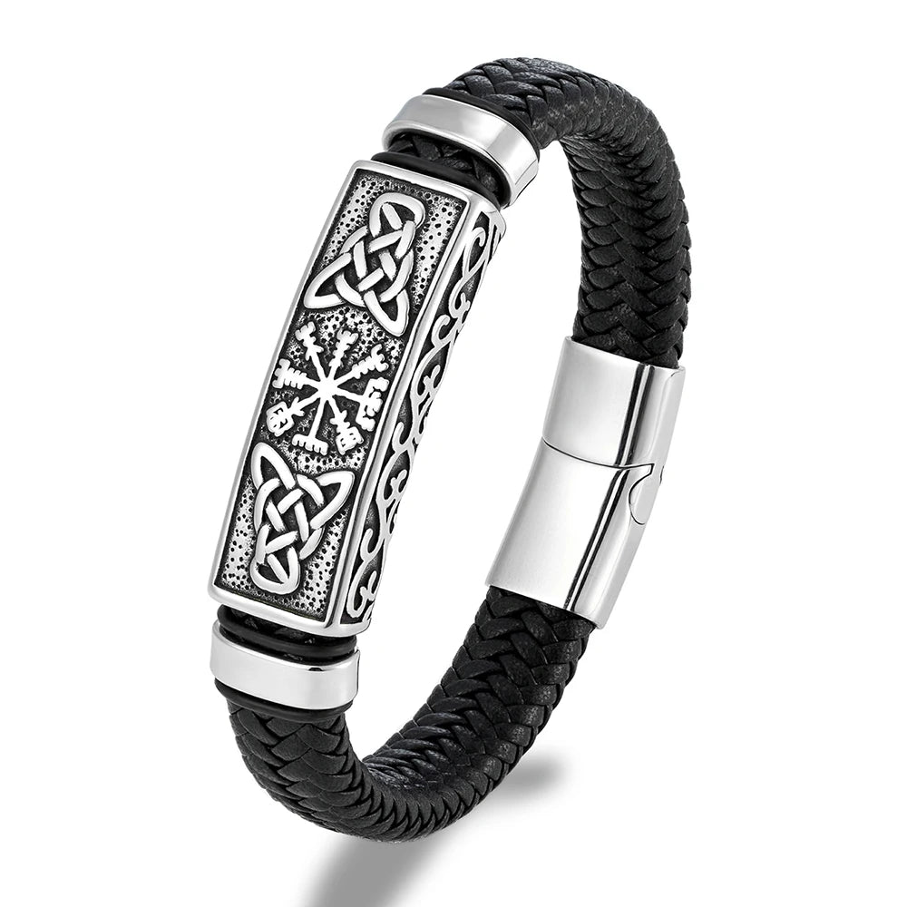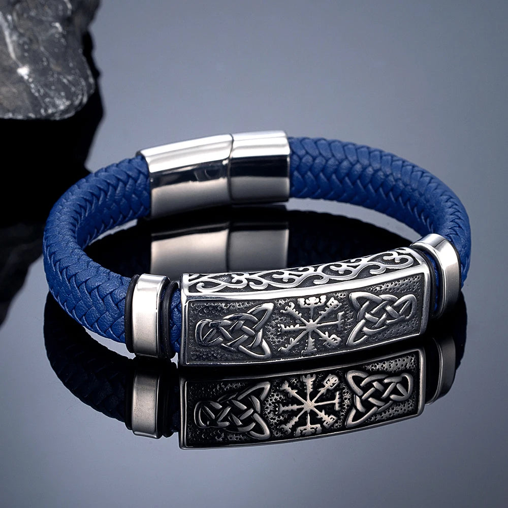 MKENDN Punk Viking Style Stainless Steel Compass Norse Runes Amulet Beads Braided Blue Leather Bracelet Homme Pulseras