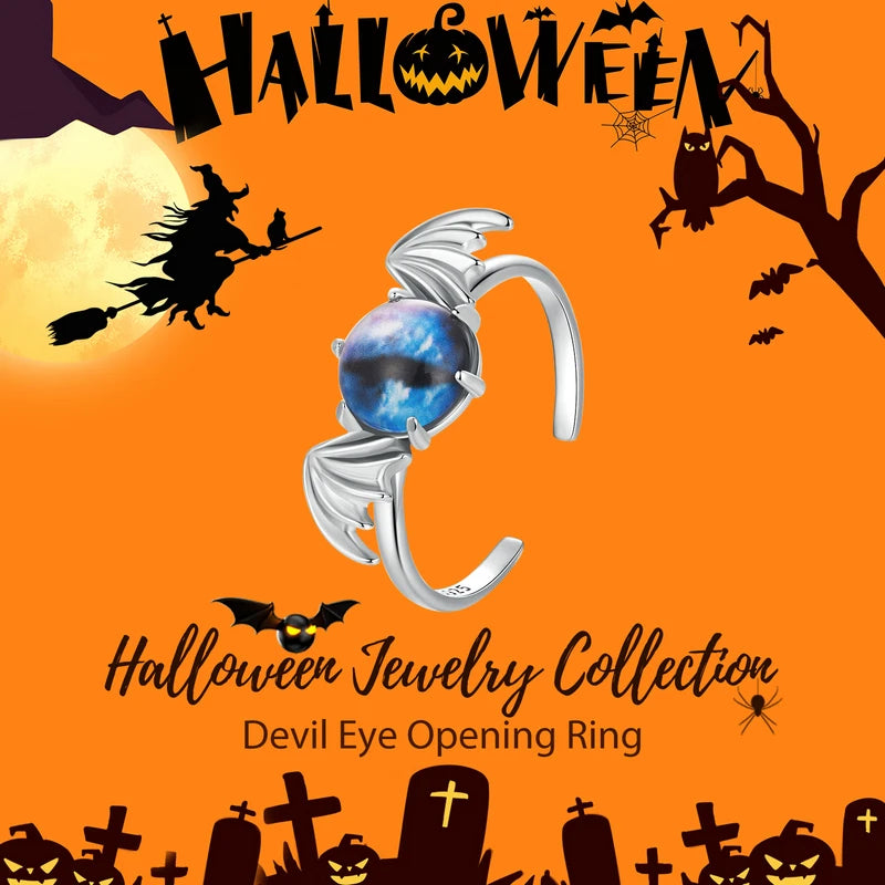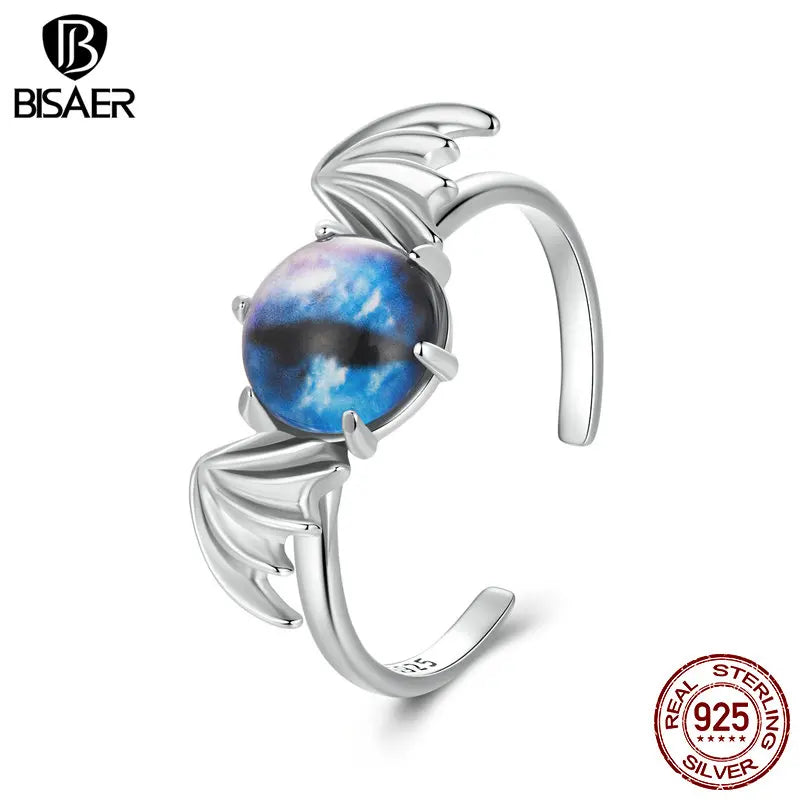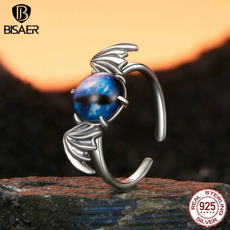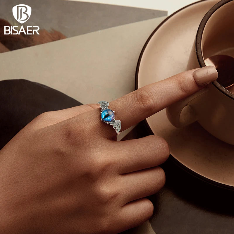 BISAER Real 925 Sterling Silver Bule Devil Eye Open Ring Adjustable Size 5-9 for Women Party Fine Jewelry Halloween Gift EFR605