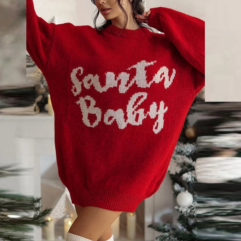 Christmas Sweater Dress Women Elegant Evening Dress Woman Autumn Winter Printed Knitted Sweaters For Women Mini Dress Jumper Red