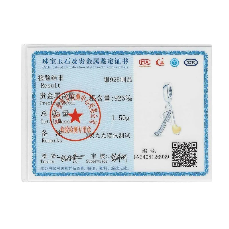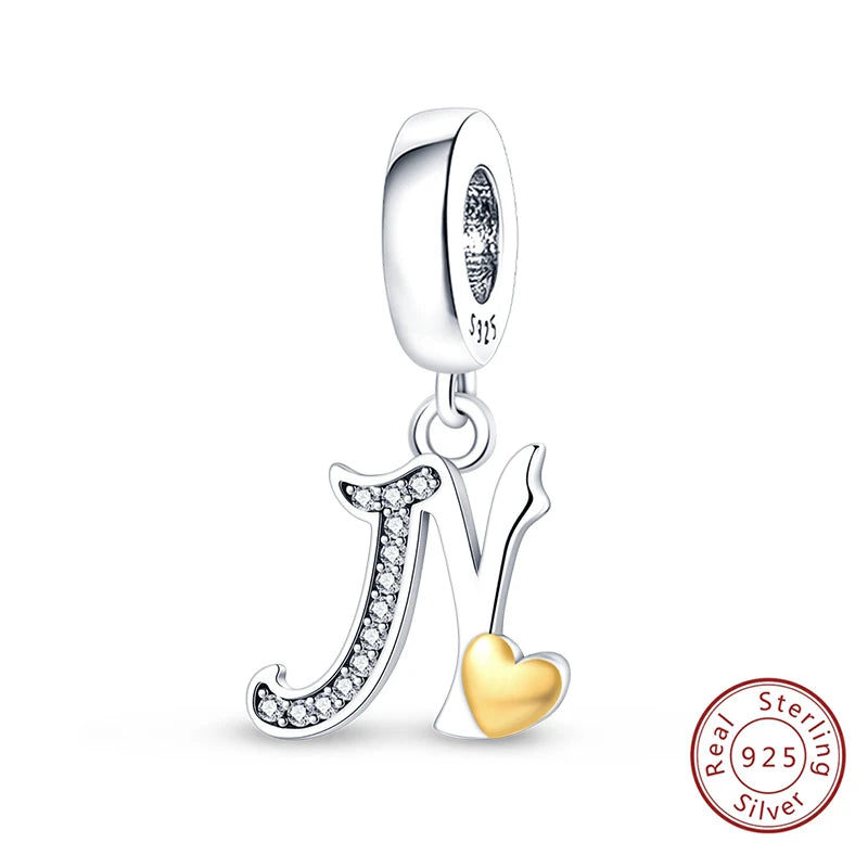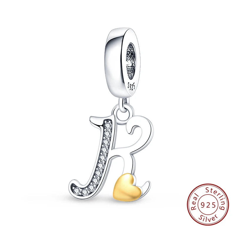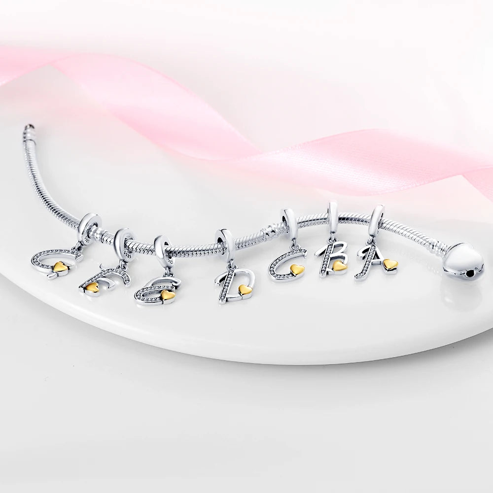 Classic 925 Sterling Silver 26 Gold Color Heart Zircon Letter A-Z Charms Beads Fit Original Bracelets DIY Birthday Jewelry Gift