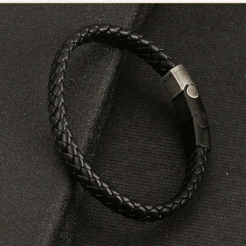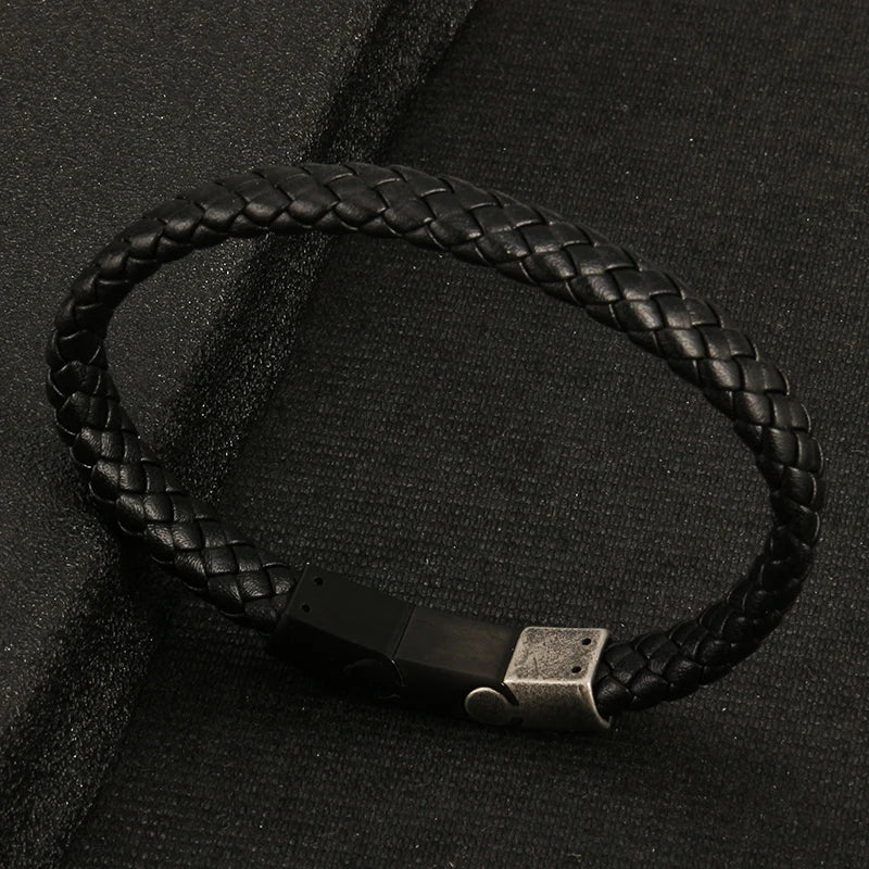 MKENDN Simple Style Men's Black Genuine Leather Bracelet Classic Stainless Steel Insert Braid Bangles For Men Friend Gift