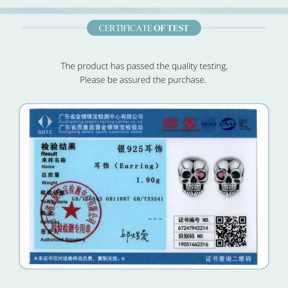 BAMOER 925 Sterling Silver Cool Skull Stud Earrings Red Heart-shaped CZ Hypoallergenic Earrings for Women Fine Jewelry SCE1771