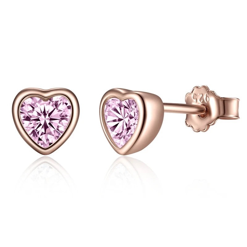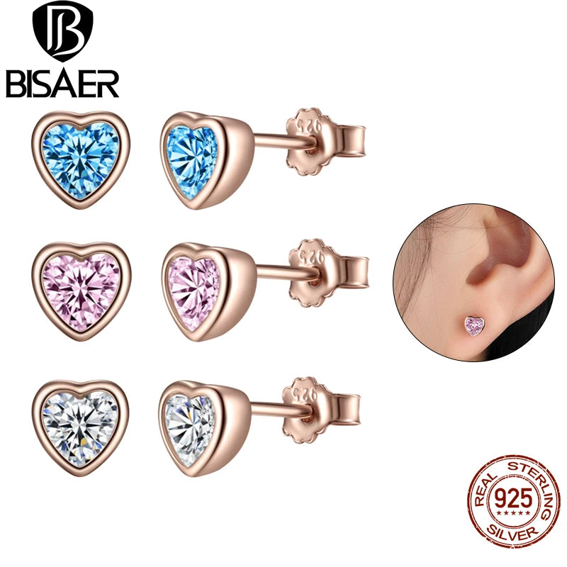BISAER Heart Stud Earrings 925 Sterling Silver Pink Love Crystal Zircon Earrings For Women Party Wedding 2022 Tend Fine Jewelry