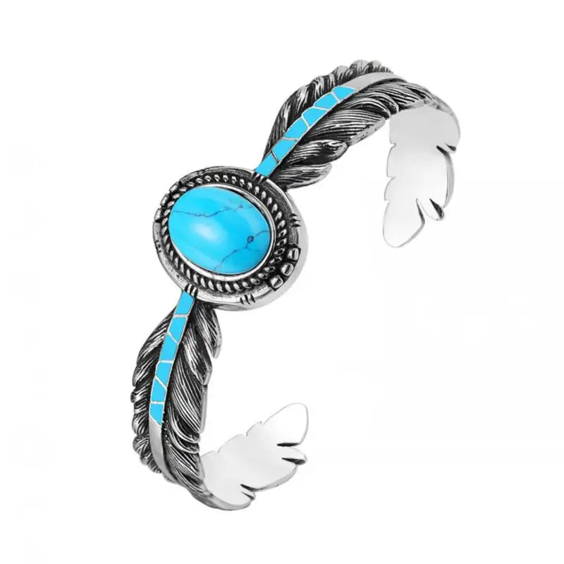 Blue Turquoise Feather Bangle Stainless Steel Jewelry Vintage Fashion Norse Viking Biker Men Women Bracelet Gift RXB0001A