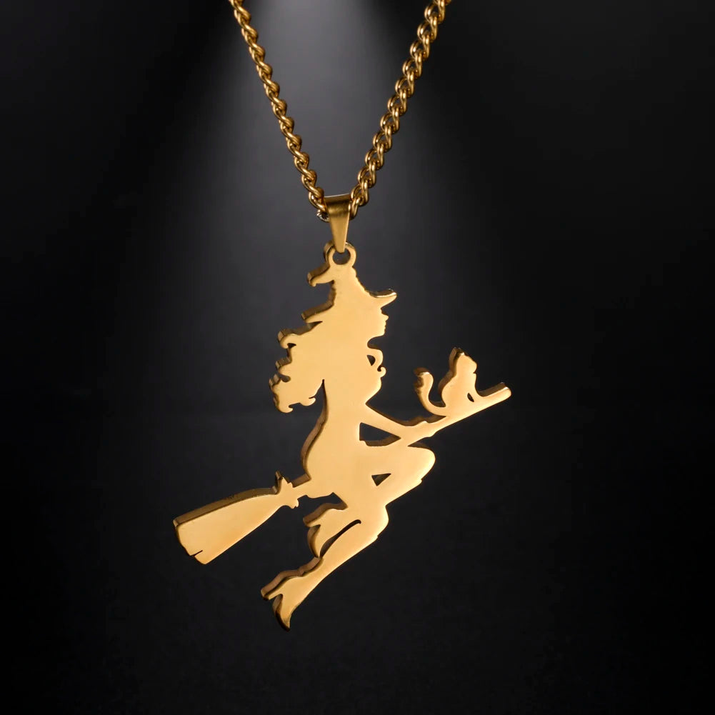 Flying Witch Silhouette Pendant Necklace for Women Fashion Stainless Steel Gold Silver Color Necklace Jewelry for Christmas Gift