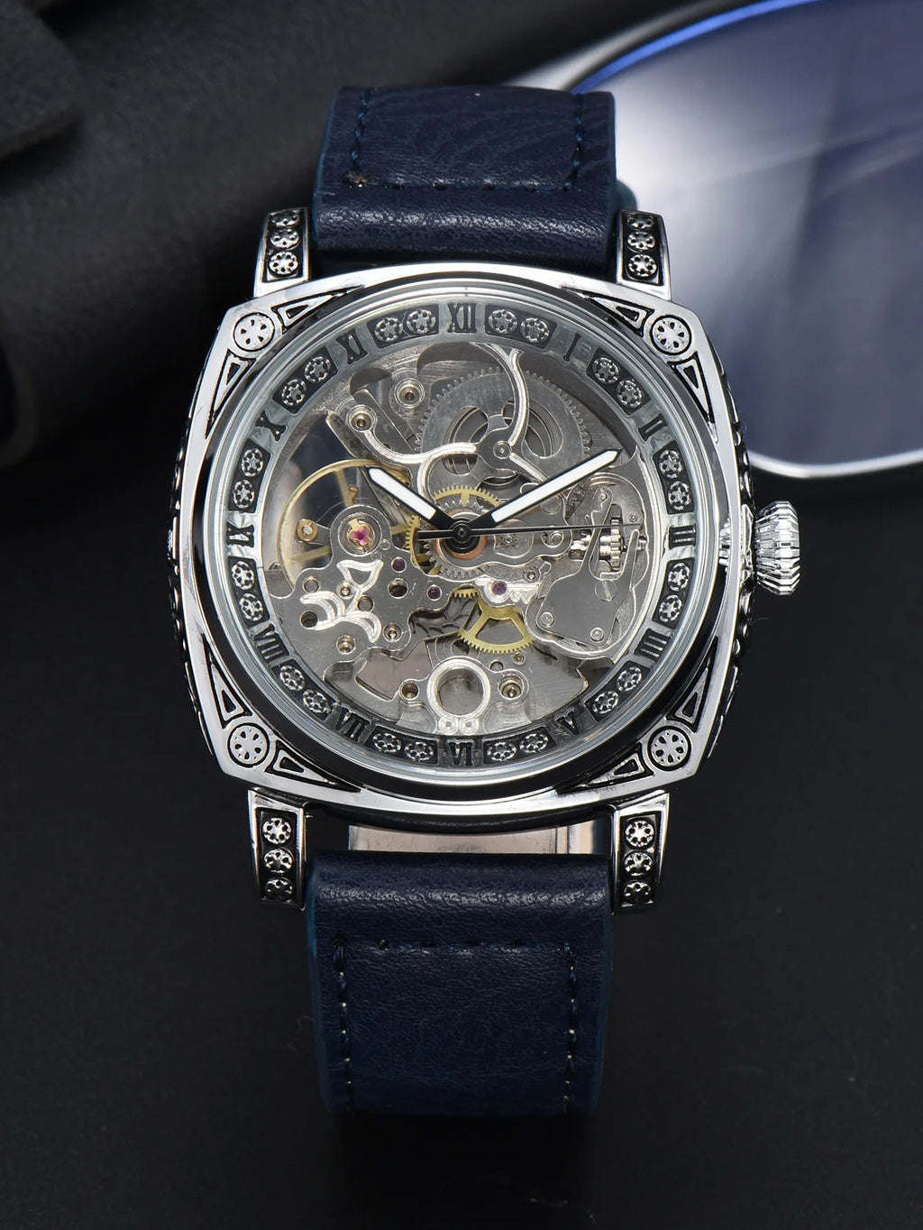 LONGLUX automatic watch retro style wholesale mechanical wristwatches skeleton carve waterproof leather no logo mens watch