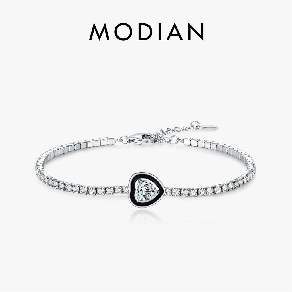 MODIAN 925 Sterling Silver Dazzling Heart Clear CZ Black Enamel Tennis Bracelets For Women Fine Jewelry Accessories
