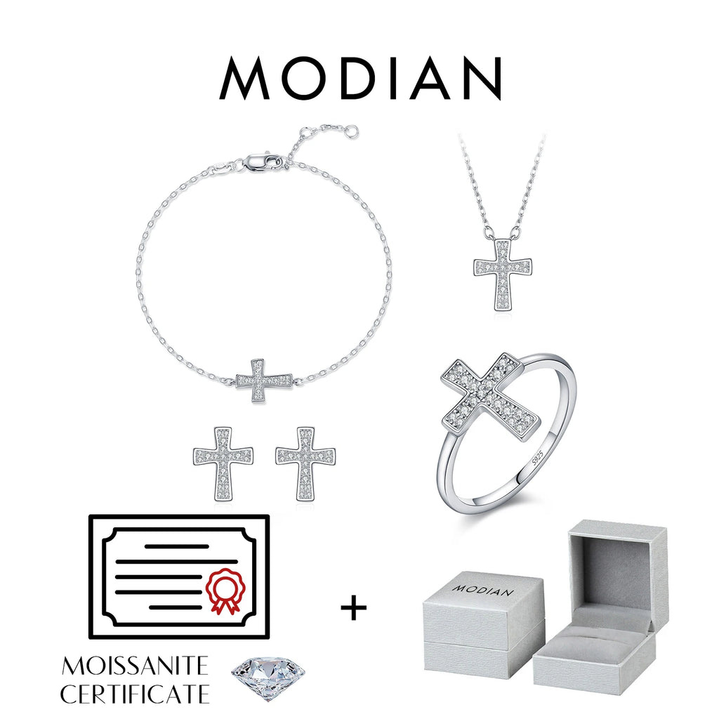 MODIAN Moissanite Sets 925 Sterling Silver Simple Cross Ear Studs Fashion Cluster Rings Bracelet Necklace For Women Fine Jewelry